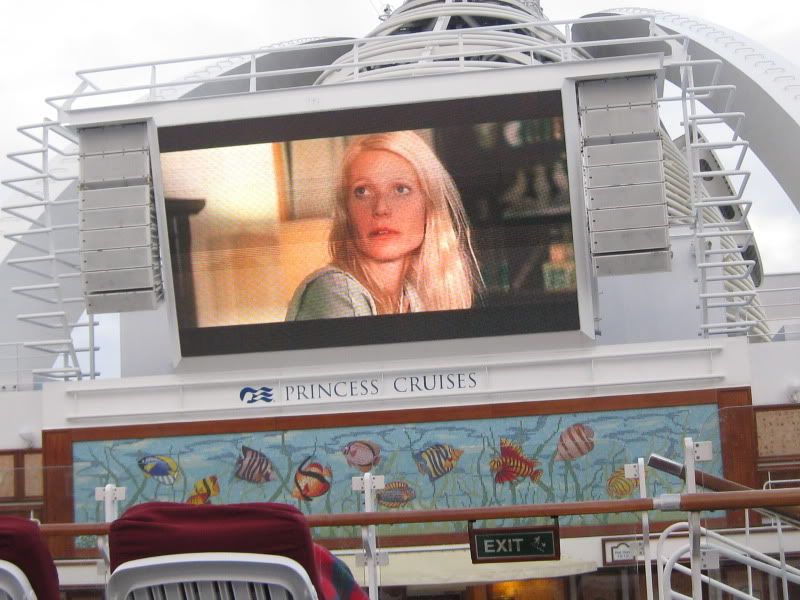 This was a cool feature of our cruise. "Movie's under the Stars." There's a huge screen on one of the upper decks and they would show current movies. It's for adults only, and you could climb up,pull up a chair, grab a blanket and some popcorn, and veg out at the end of a long tour day.Of course, most of the people are like zombies sitting there after an exhausting day, but it was fun anyway. Mom and I stayed out for a whole hour! (which is saying something since it wasn't exactly warm...)